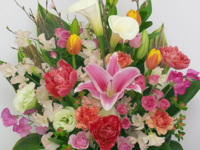 オリエンタル系のユリをメインに、春らしい花材をあしらって
